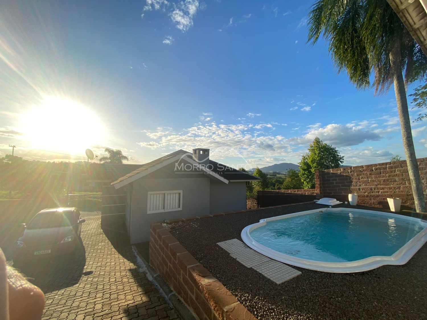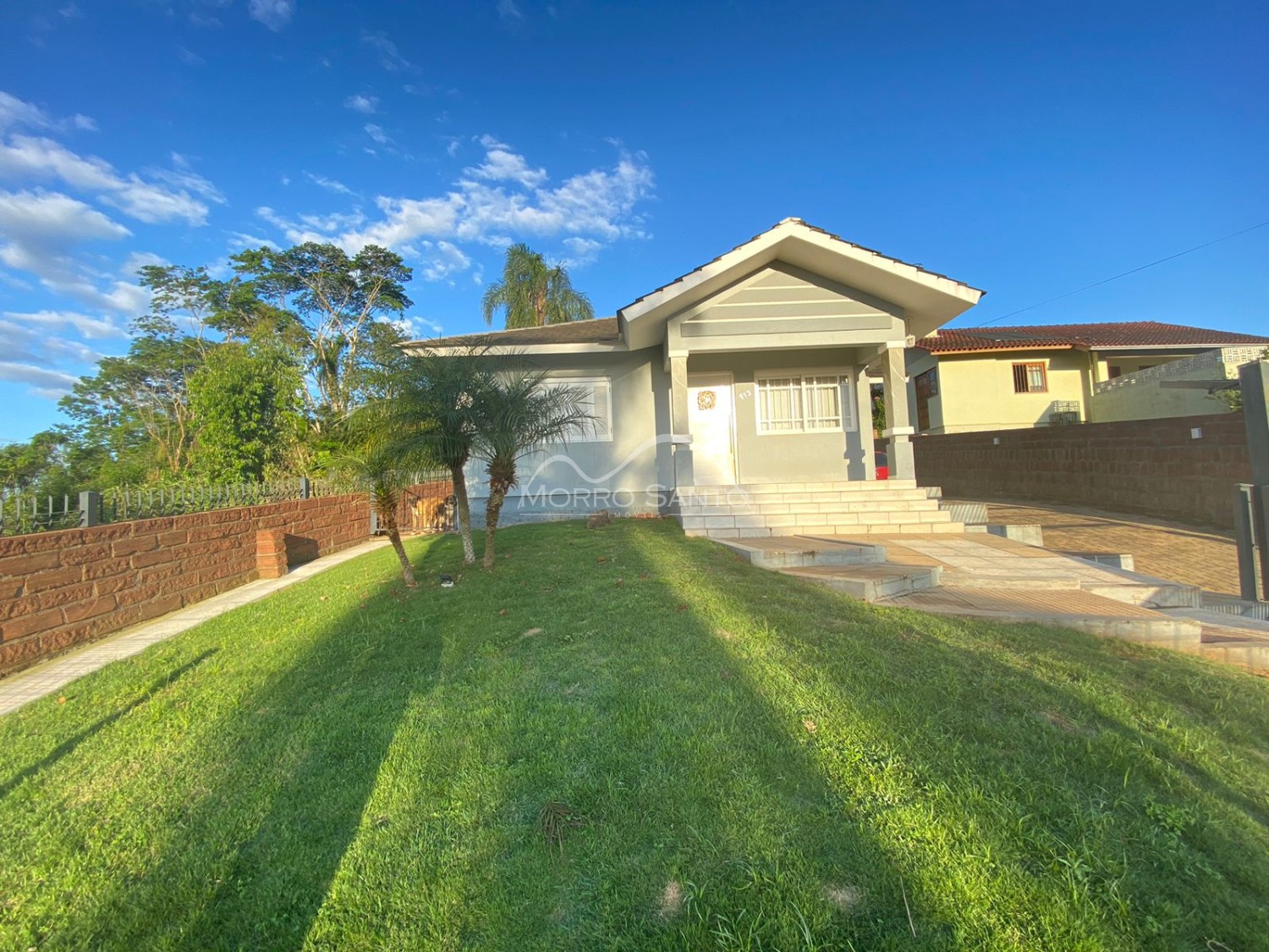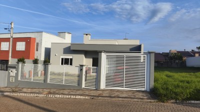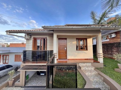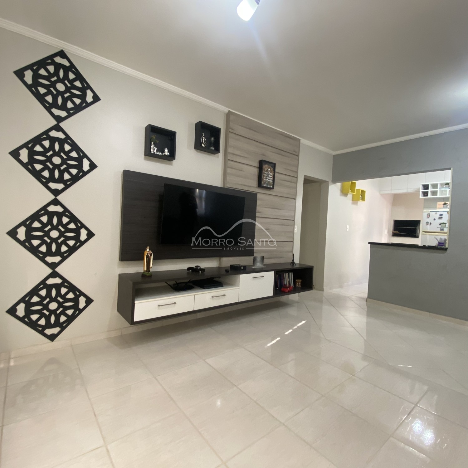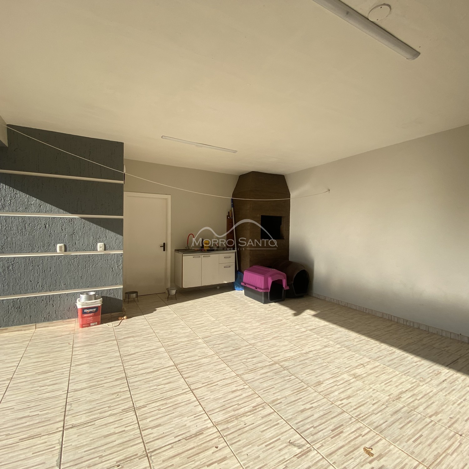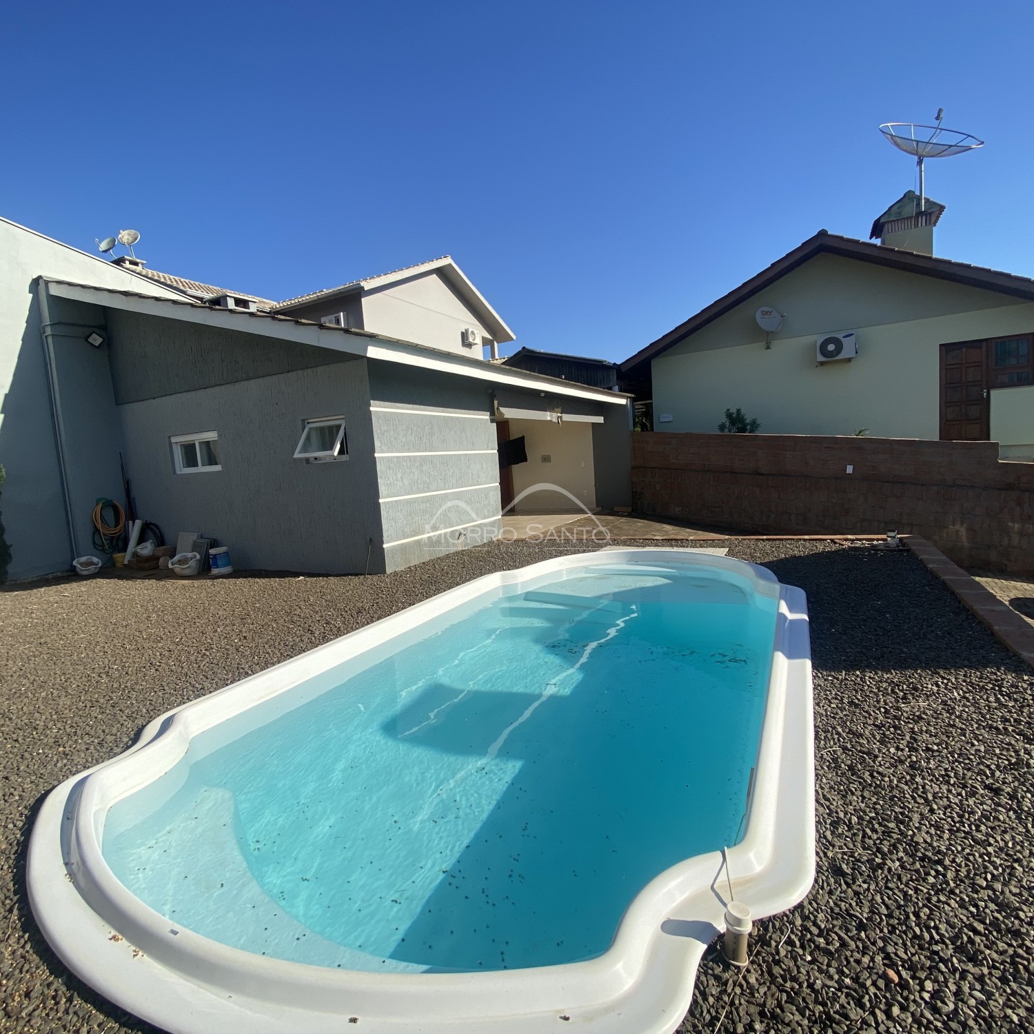 Descrição › Casa no bairro Campestre, com terreno de 467,74m2 , casa com 109m², distribuída em 2 dormitórios, banheiro social, sala de estar integrado com sala de jantar, cozinha, lavanderia com churrasqueira, garagem para 2 carros com churrasqueira, depósito e piscina. Toda murada e grade. ficam os móveis planejados de cozinha, rack da sala, móveis do banheiro e mesa embutida de 8 lugares.